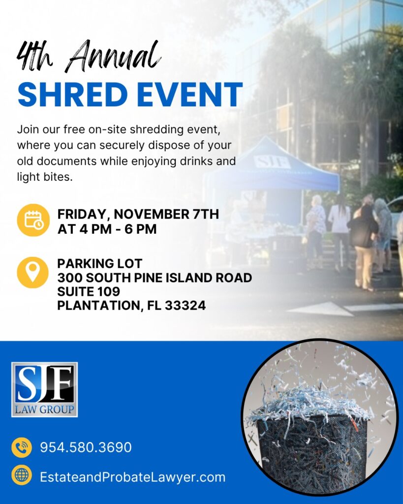 Enjoy complimentary light refreshments while connecting with neighbors and our SJF Law Group team. If you can’t make it in person, you’re welcome to drop off your documents during regular business hours, and we’ll ensure they’re safely shredded on your behalf.