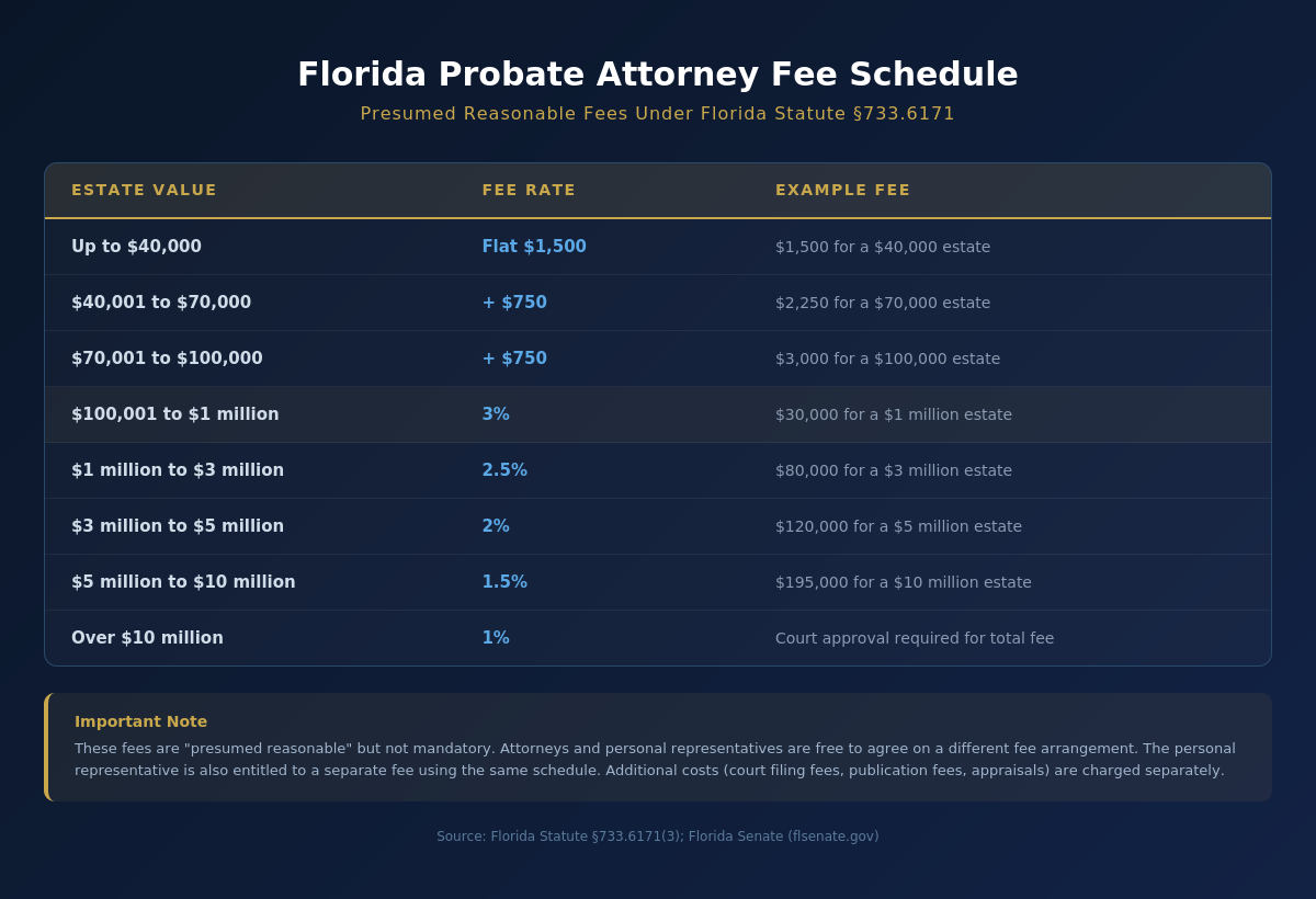 Florida Statute §733.6171 sets a presumed reasonable fee schedule. For estates up to $100,000, the fee is $3,000. For estates between $100,000 and $1 million, the rate is 3%. For estates between $1 million and $3 million, the rate drops to 2.5%. Additional costs include filing fees, publication fees, and appraisals.